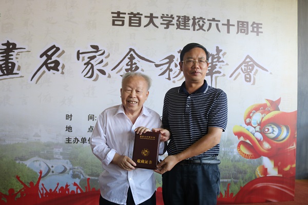 随后,各位书画家将自己创作的作品捐赠给吉首大学。黄昕代表吉首大学接受捐赠,并为他们颁发收藏证书。