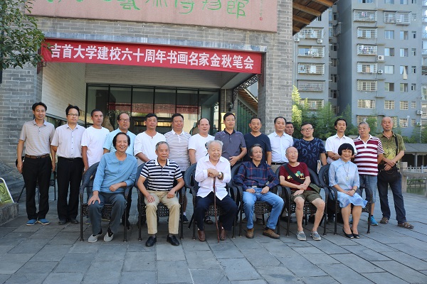 本网讯(见闻)金风送爽,书画传情。2018年9月8日下午,座落在吉首大学风雨湖畔的黄永玉艺术博物馆,高朋满座,林时九、曾令刚、田明、舒湘汉、田大年、刘莉、吴正义、杨刚、王锡忠、王焕林、邓光明、田冰、林东浒、袁晋勇、夏令兵等湘西籍书画名家齐聚于此,参加“吉首大学建校六十周年书画名家金秋笔会”。