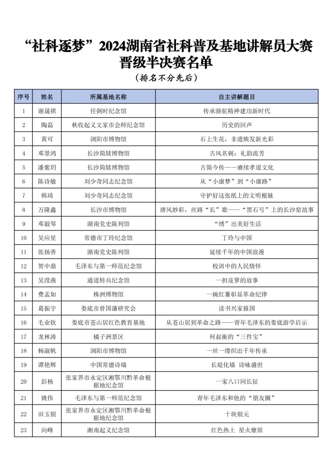 “社科逐梦”2024年湖南省社科普及基地讲解员大赛晋级半决赛名单名单公布