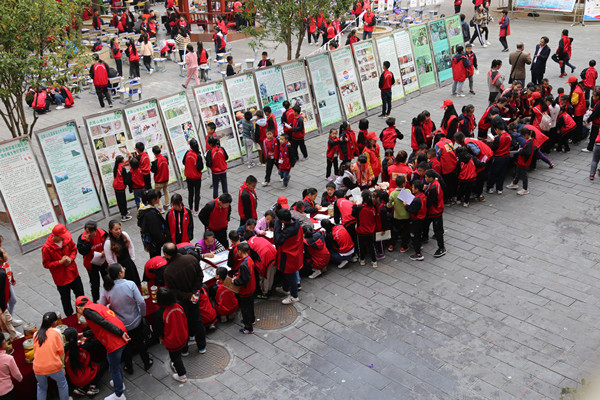 活动开展期间,铁路学校的学生们都很活跃,不论是在展板前还是标本前,都挤满了人,他们有的伏在桌子上、有的蹲在地上,都在认真地记笔记,还时不时抬起头来询问志愿者有关标本的问题,志愿者们都耐心地一一为他们解答。