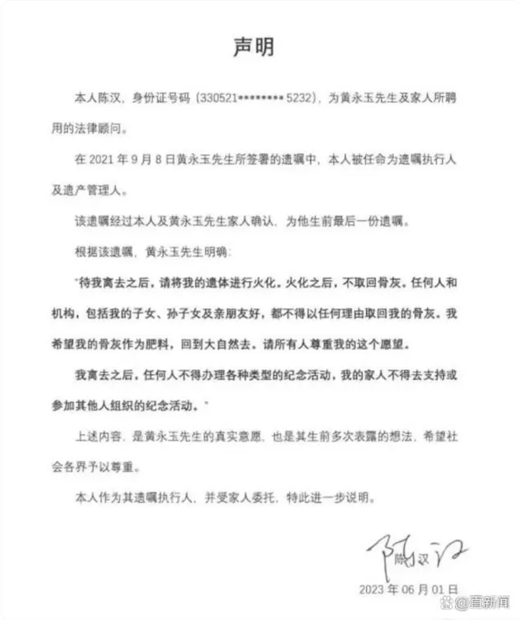 最终版方案,在2023年6月14日公布了。“我希望我的骨灰作为肥料,回到大自然去。请所有人尊重我的这个愿望。”
