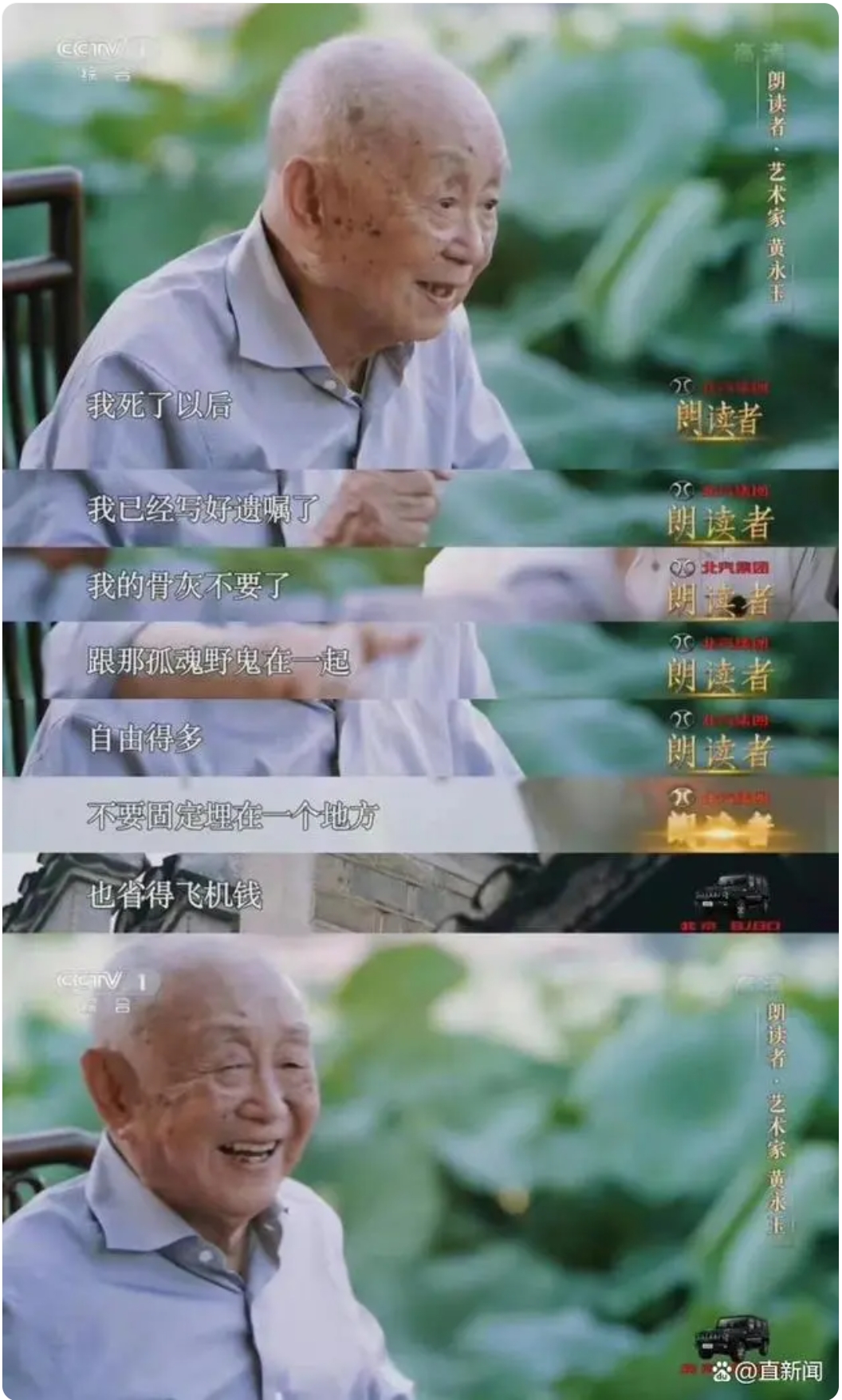 “我的朋友死了,我都好像没有悲哀过,不晓得为什么,郁风死了,黄苗子死了,丁聪死了,汪曾祺死了……一听到消息,会停顿几秒钟,但没有太多的悲哀,因为人是一定要死的。然后呢,就开始感觉到在慢慢地想念他(她),记忆里都是那些美好的事,一点也不伤感。”