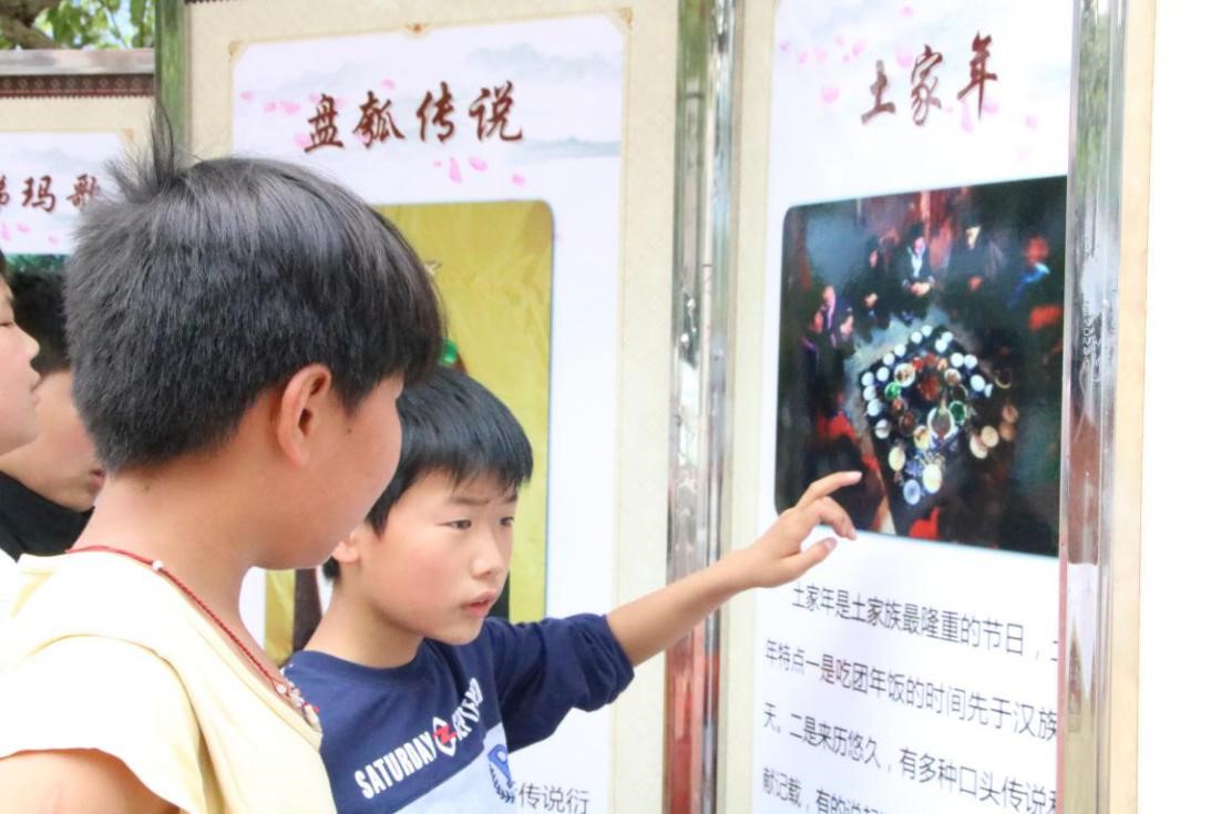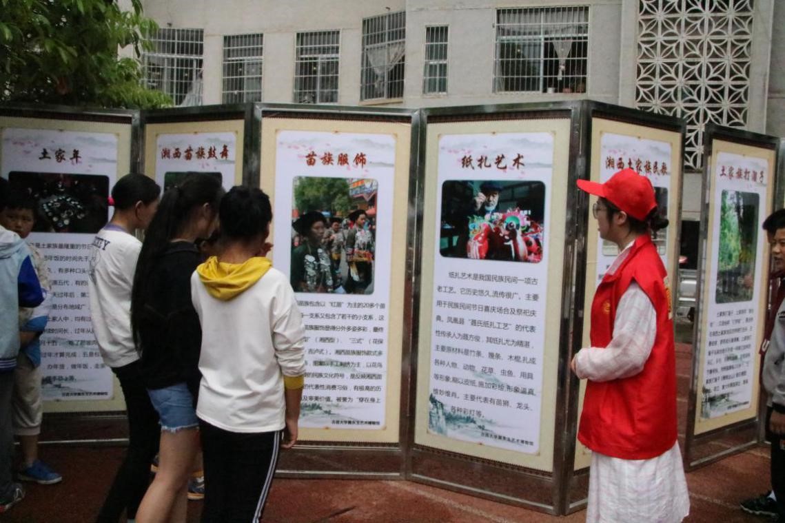 本次活动展览了大量的湘西地区的非物质文化遗产展板,如苗族服饰、土家年、土家族的哭嫁等,志愿者的精彩讲解吸引众多学生和群众前来参观。当地学生和民众对展板内容热情度极高,纷纷前来观看,还不时向志愿者讲解员发出提问,与他们交流。