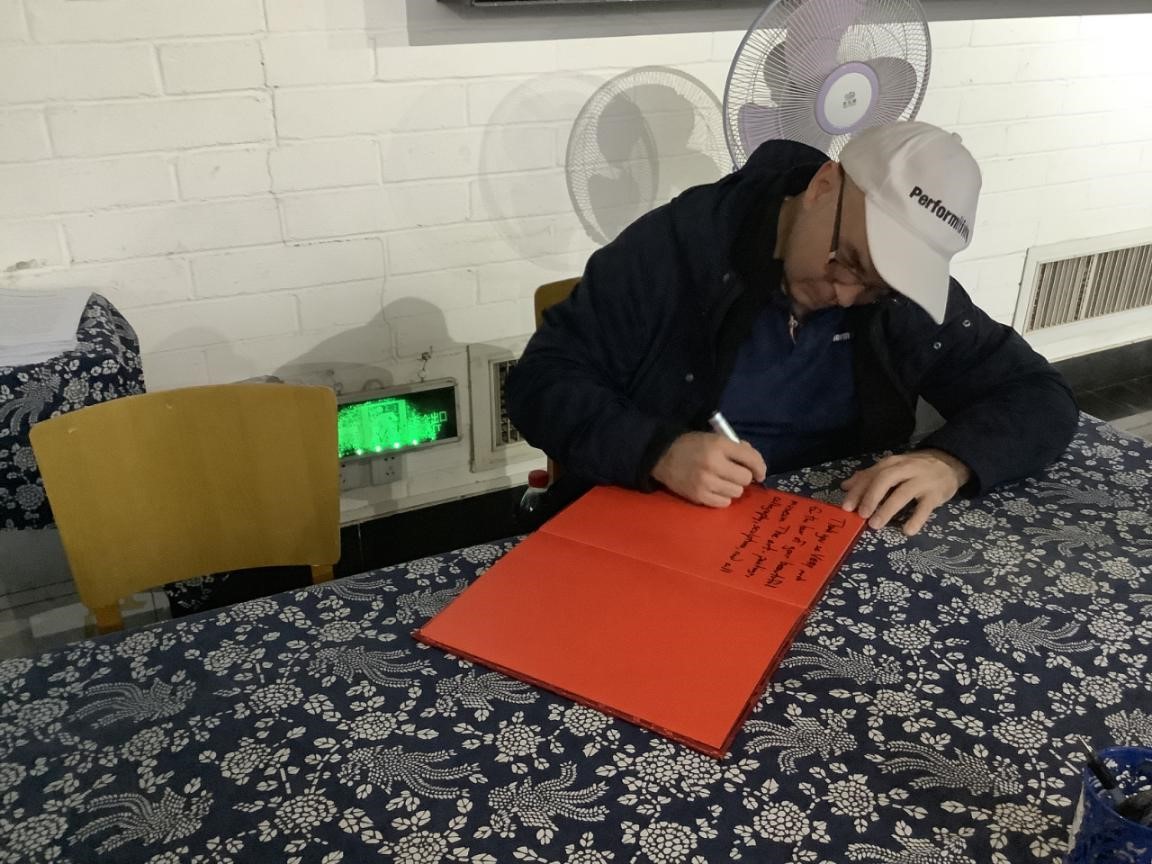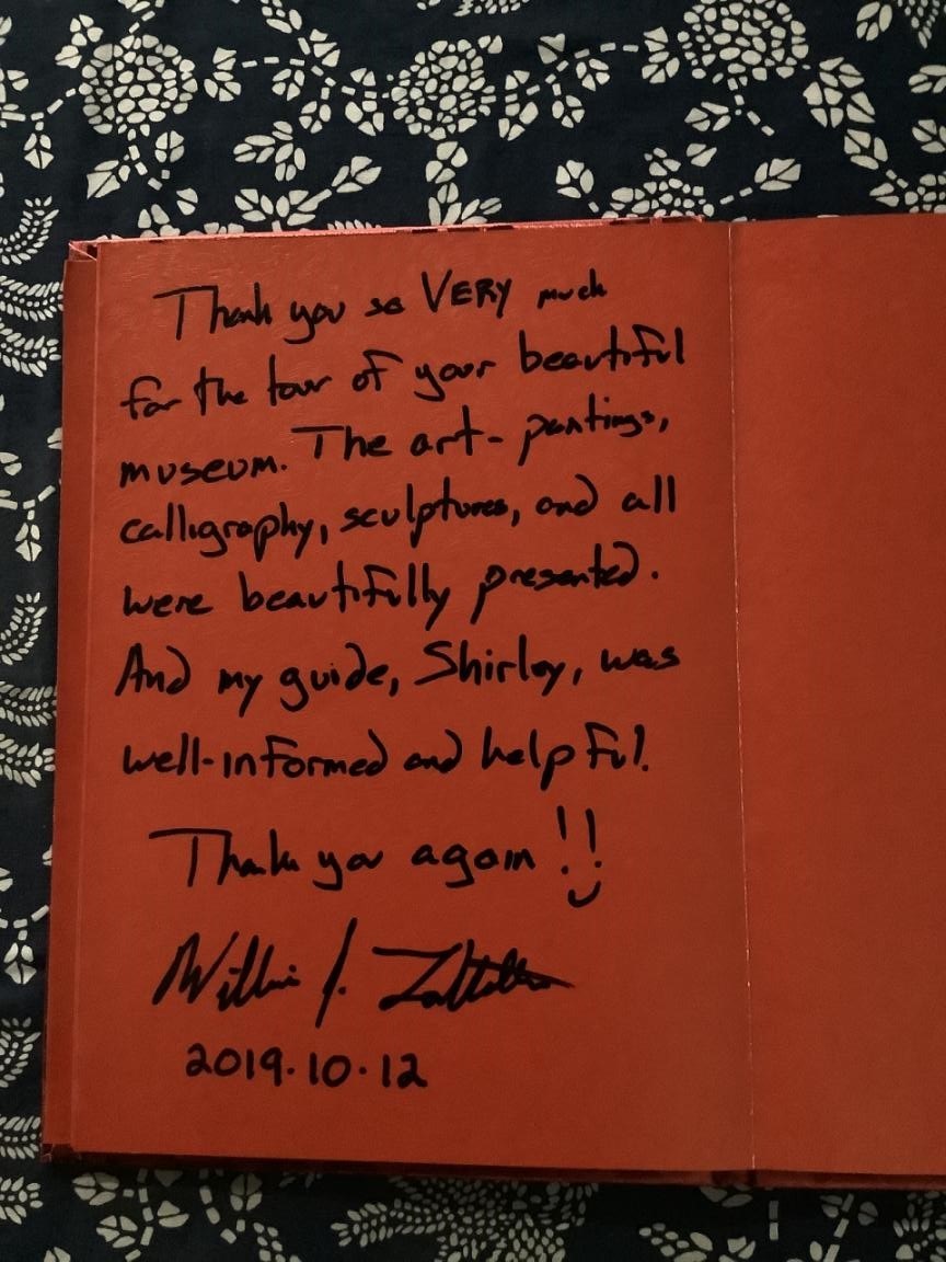 据了解,William Ledbetter作为新加坡艺声教育的创始人之一,是一位有着丰富经验的教育家、激励者、主持人及表演者,并对莎士比亚的作品颇有研究。在本次的参观过程当中,他对黄永玉先生的作品和收藏品表示赞赏。他提到,他最喜欢一幅名为《水仙》的画作,因为其中体现了印象派的画法并且画中的颜色层次分明。参观结束后,他写下了本次的感受,Theart, paintings, calligraphy, sculpture and all were beautifully presented.翻译为艺术品、画作、书法、浮雕和所有的一切都完美地呈现。