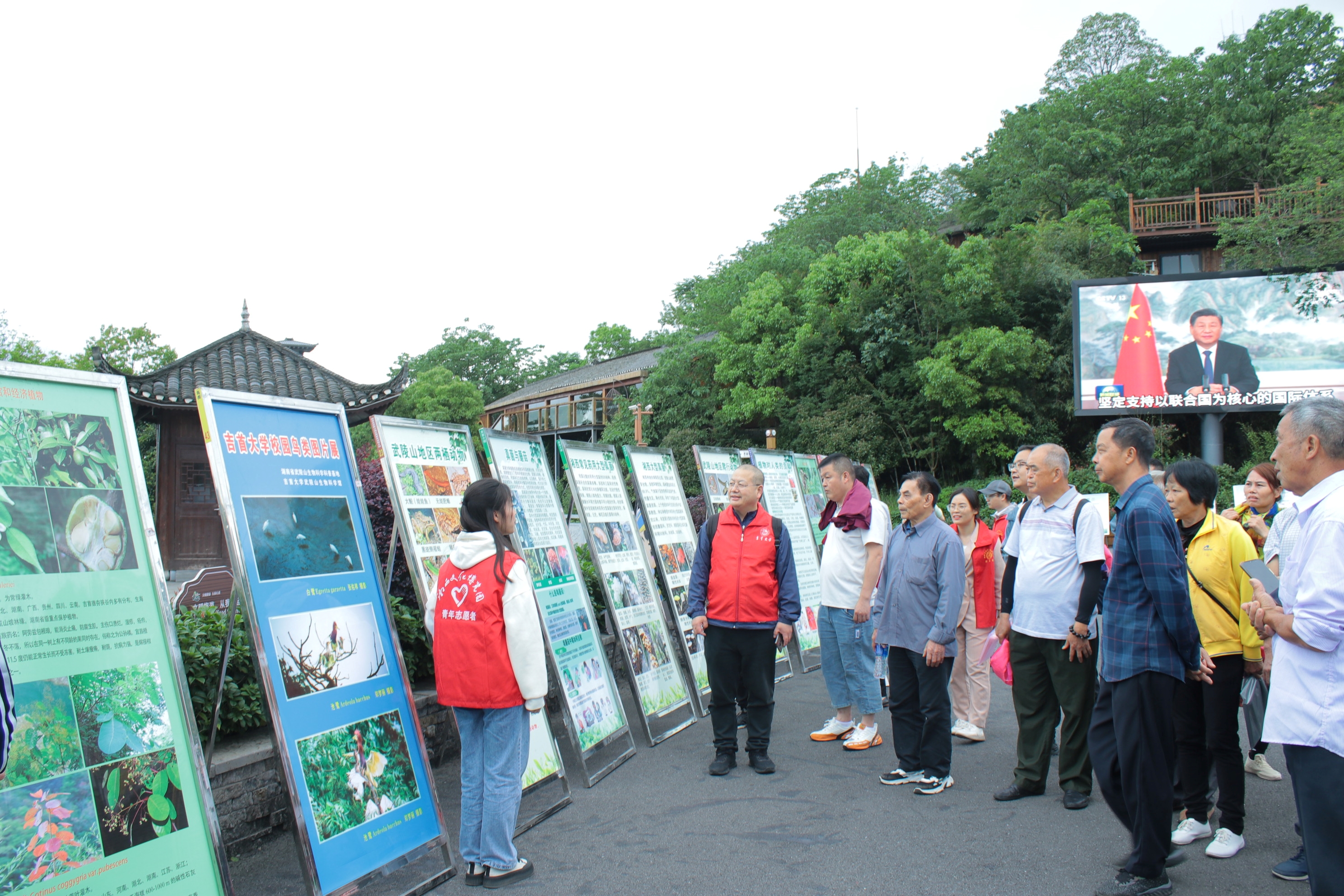 启动仪式后,与会人员走进矮寨大桥坡头前坪布置的湘西地区生物多样性科学普及展览,我校文化场馆中心的学生志愿讲解员用生动有趣的语言为大家分别介绍了不同专题板块的内容,如武陵山地区两栖动物以及爬行动物、湘西常见大型药用真菌、植物对人类的贡献等,吸引了不少现场游客驻足观看。在场人员纷纷表示,通过不同展板的内容以及志愿者们深入浅出的讲解,对湘西地区的生物多样性情况有了进一步的了解,对自然美景的敬畏和珍惜之情也进一步提升。