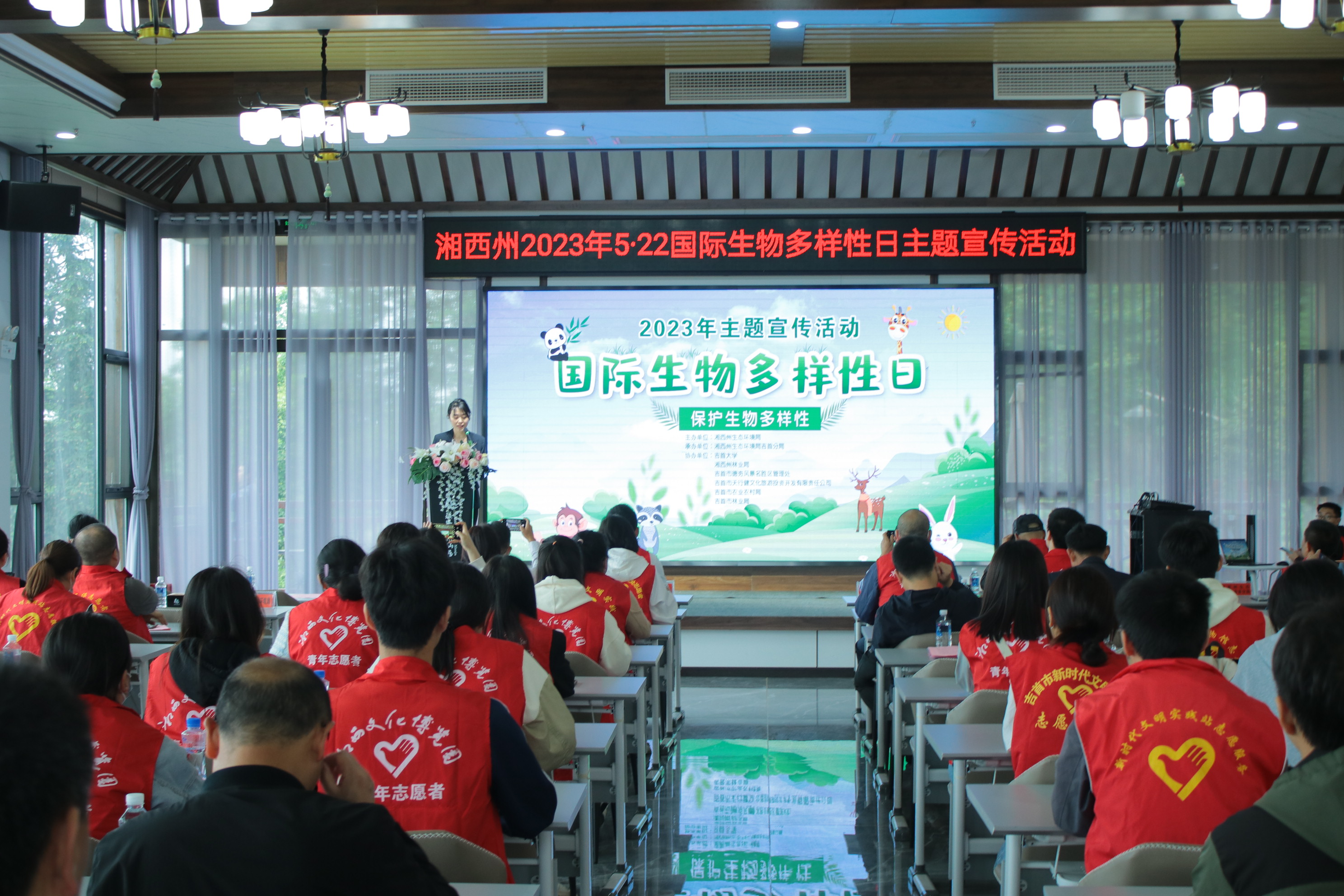 在启动仪式上,我校师生代表和与会人员共同观看了《湖南省生态环境保护科普片——什么是生物多样性》,对生物多样性相关知识以及湖南省丰富的生物多样性有了进一步了解。随后,我校生物资源与环境科学学院刘世彪教授受邀进行现场科普授课,刘教授以《湘西州的生物多样性及其保护》为题,为大家介绍了湘西三个国家级自然保护区生物多样性的基本情况以及湘西地区生物多样性的具体数据。现场还开展了生物多样性保护知识有奖问答活动,进一步扩展了大家对生物多样性知识的了解与认知。