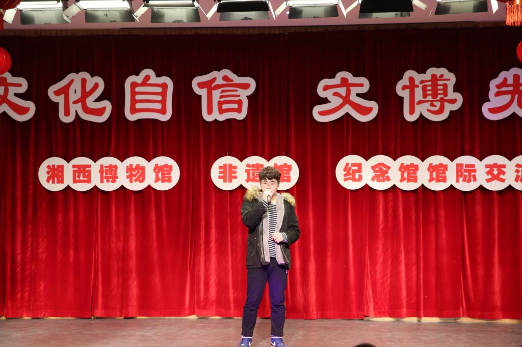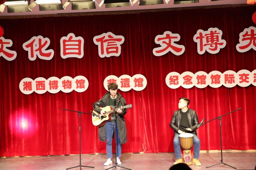 接着,馆际交流文艺汇演开始了。由湘西土家族苗族自治州博物馆-非遗馆的讲解员们为我们带来开场舞《中国美》,随后,他们一起朗诵了《我是博物馆人》,将文物的故事诉说,将博物馆人的情怀吟诵。永顺塔卧湘鄂川黔革命根据地表演的舞蹈《那年的塔卧》,让我们看到战争里真挚的情谊。吉首大学文化教育场管理中心带来的是吉他弹唱《平凡之路》,告诉我们不忘初心,在平凡之路上继续前行……最后,本次汇演在欢快的鼓声中拉下帷幕。