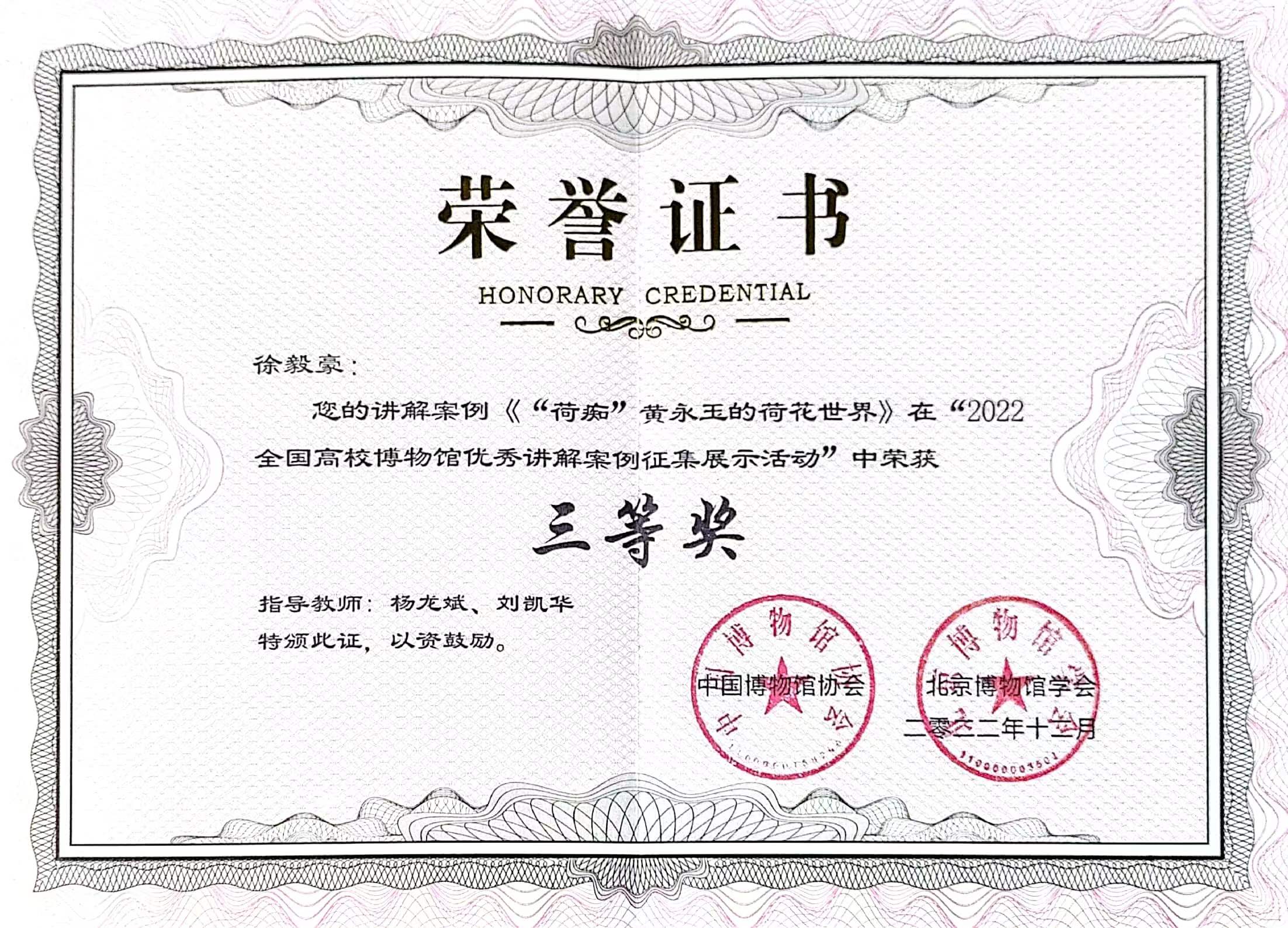 本网讯(通讯员徐毅豪)2022年12月16日,经国家文物局批准,由中国博物馆协会与北京博物馆学会主办的2022全国高校博物馆优秀讲解案例征集展示活动获奖名单公布,我中心讲解员、2020级本科生徐毅豪荣获三等奖。