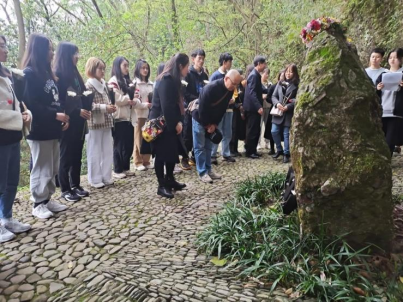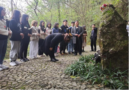 沿沱江而上,志愿者们一路步行到达了沈从文先生墓地。在志愿者队长彭衍蒿的主持下,扫墓活动正式开始。所有老师与志愿者们依次敬献白菊并庄重地三鞠躬,以表对先生的怀念与敬仰之情。