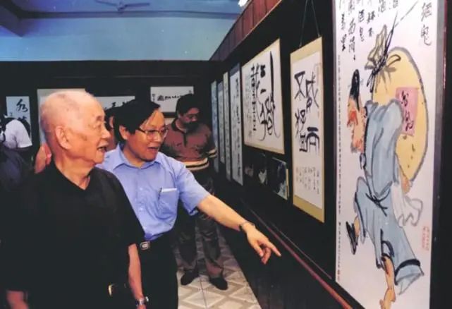 ▲ 为湘泉、酒鬼作瓶型设计的黄永玉先生(左一)参观湘泉艺术馆,看着自己创作的《酒鬼背酒鬼》,他开心地笑了(湘西团结报记者 摄)