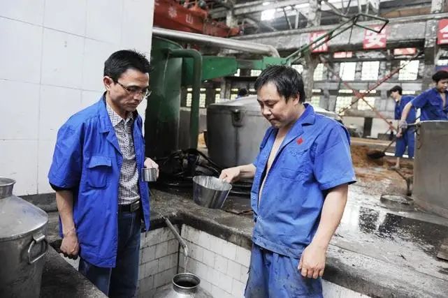 ▲ 出酒品酒需老师傅把关,车间主任余冰(左一),是酒鬼酒酿制技艺传承人,在酒鬼酒车间已工作20多年,他与班长田国富(左二)负责品酒,严把质量关口
