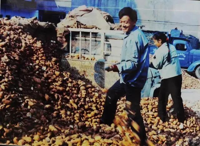 ▲ 吉首酒厂创业之初的王锡炳厂长在大田湾老厂卸铲酿酒红薯原料