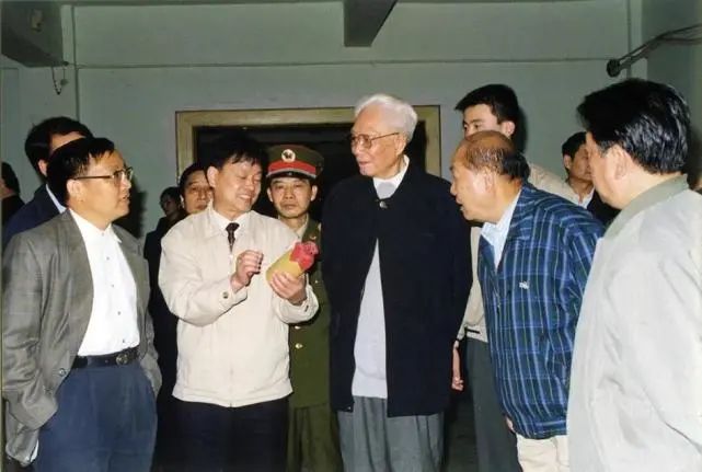 ▲ 张震将军考察湘酒鬼公司,王锡炳董事长介绍企业产品