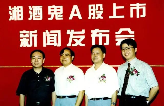 ▲ 1997年7月,湘酒鬼A股在深交所挂牌上市,湘酒鬼公司董事长王锡炳(左三)与武吉海(左二)及湘财证券董事长陈学云(左四)、副总裁张世明(左一)等参加发行挂牌仪式