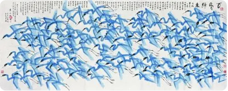 《集美学村》和《百鸟归来》均为大尺寸画作,《集美学村》长达6米,《百鸟归来》的长度也达到了3.6米。《集美学村》是黄永玉根据他1995年回集美母校时的写生所画,长卷描摹了南薰楼、鳌园等具有代表性的学村建筑。《百鸟归来》则以象征手法,用“鸟儿归来”的场景寓意海内外校友回到母校、共贺百年之庆的盛况。