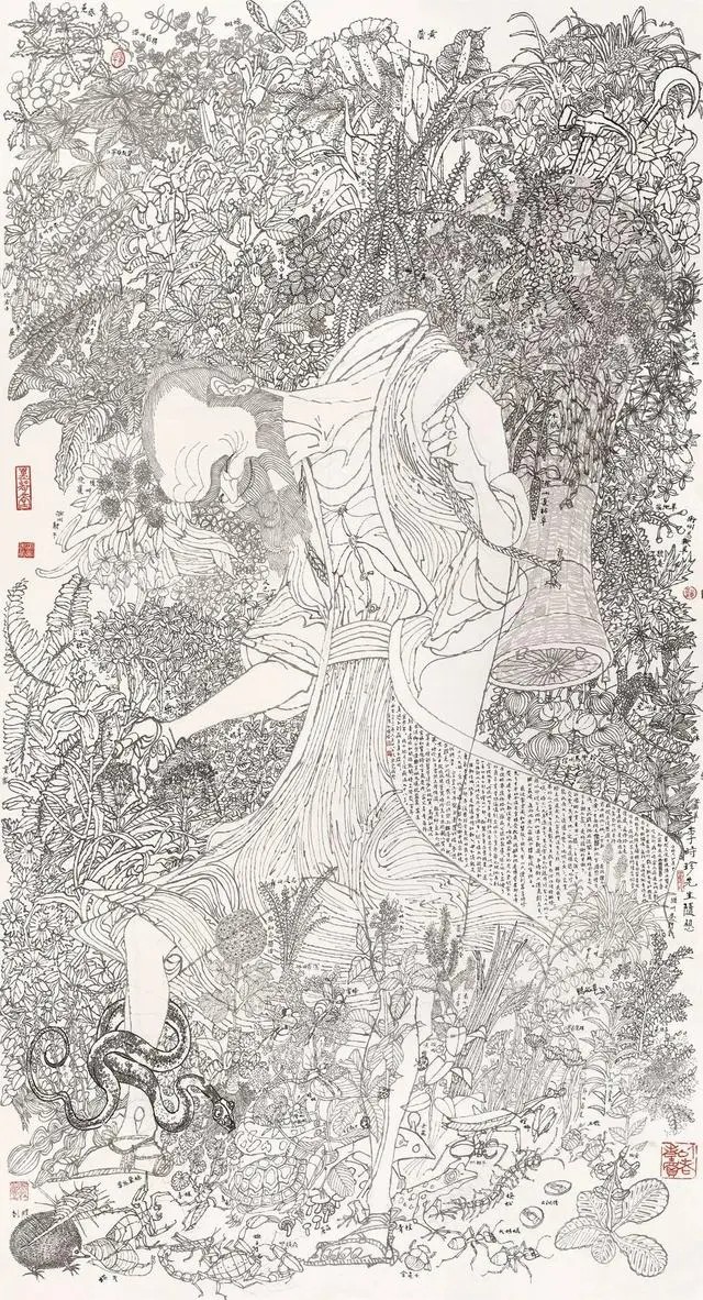 “画画的人,永远是个孤独的行者”159件作品中,一幅长4米、宽3.6米的巨幅画作格外抢眼,此画名为《林中景》,黄永玉2022年绘制完成。色彩斑斓、品种各异的花草林木,活灵活现的男女老少,用色大胆、笔触细腻,观众无不仰头沉浸于这份震撼。再如《李时珍先生随想》,整幅画面被细密的线条充斥,繁杂却有序,主人公李时珍的周边,布满了各种植物、药材及虫兽,黑白韵致间极具视觉冲击力。