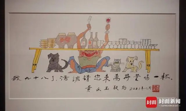 《98岁生日卡》创作于2021年8月,画中老者高举斟满美酒的酒杯,开怀大笑,发出邀约——“我九十八了,活该请您来万荷堂喝一杯”。长条桌摆满了大小各异的酒坛、酒瓶、酒杯,家中猫狗也和主人并坐一排,共同迎接客人的到来。这,是黄永玉为生日邀请宾客而作的请柬。