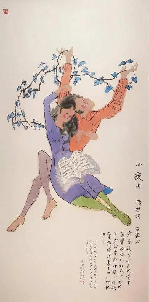 《小夜曲》是黄永玉生命中最后一幅画作,创作于2023年5月16日,一个月后,“老顽童”溘然长逝。画面上,一对男女亲密依偎,藤蔓环绕,沉浸在《小夜曲》的浪漫旋律中。画中人物便是黄永玉和他的妻子张梅溪。“画画的人,永远是个孤独的行者。他要对付自身、身旁、世界、所有的惊涛骇浪的人情世故,用极大的克制力维持创作环境的宁静、安详。”这是黄永玉曾发出的感慨。2023年6月13日,“老顽童”走完了自由而潇洒的一生。他在遗嘱里说,遗体火化后不要取回骨灰,“希望我的骨灰作为肥料,回归大自然”。展厅内,一方长桌之上,雕塑家许鸿飞创作的黄永玉像手持烟斗,神色怡然,似乎在静静看着展厅的观众。“看着他的塑像,我感觉还是那么亲切,就像他依然在。”许鸿飞说。