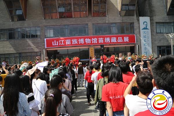 本网讯(记者见闻 学生记者许乐清)2017年5月18日是第41个国际博物馆日。当天上午,凤凰山江苗族博物馆苗绣藏品展览在我校砂子坳校区齐鲁大楼真善美展厅开展。我校党委委员、副校长黄昕,我校原副校长张永康,原湘西州政协主席龙德忠,原湘西州常委、宣传部部长田景安,原湘西州人大常委会副主任人大常委会副主任龙友芳,原湘西州人民政府副州长、凤凰山江苗族博物馆馆长龙文玉等出席开展仪式。我校民族师范学院副院长、山江苗族博物馆副馆长石群勇主持开展仪式。