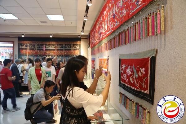 黄昕在开展仪式上致辞。他代表学校党委、行政对各位领导、嘉宾、师生的到来表示热烈欢迎,对凤凰山江苗族博物馆苗绣藏品展览在我校成功举办表示衷心祝贺。他简要介绍了龙文玉先生在挖掘、整理、研究、传播苗绣和苗族文化方面所作出的卓越贡献,号召全体师生学习龙文玉先生的家国情怀、教育情怀和公益情怀。黄昕强调,参观苗绣藏品展览,要从苗绣的一针一线中学习和感受苗族文化的历史,学习和感受其博大精深的美学价值和文化价值,从而继承和发扬中华优秀传统文化,进一步提升民族自豪感和文化自信。