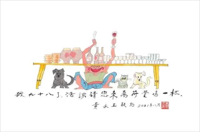 黄永玉98岁时作的画,上面题着「我九十八了,活该请您来万荷堂喝一杯。」