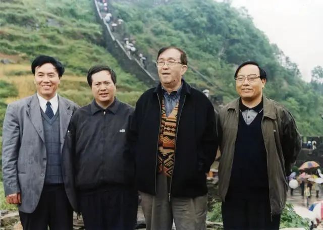 ▲ 时任凤凰县县长吴彦承等陪同谢晋导演考察凤凰县拉壕段中国南方长城(左起:宋克湘、吴彦承、谢晋、武吉海)