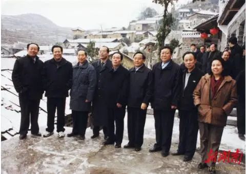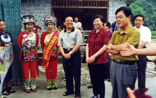 ▲ 2000年,时任分管旅游的湖南省副省长贺同新(右一)与省旅游局局长袁新华(右二)考察德夯拦门敬酒