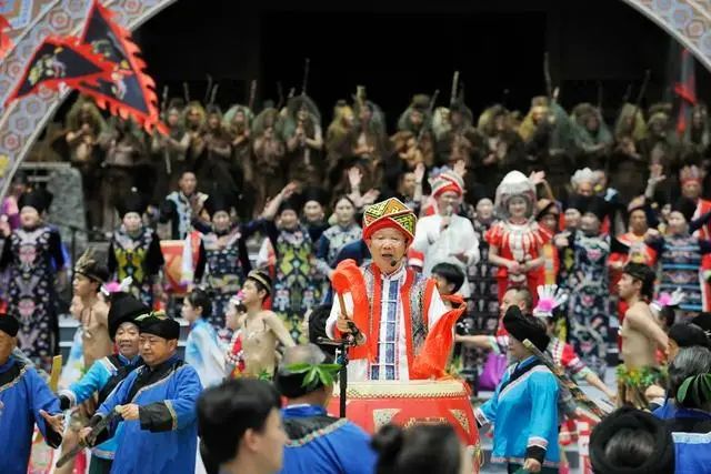 ▲ 2023年7月,龙山县在惹巴拉村举办旅发大会,土家打溜子国家级非遗传承人田隆信在土司营地击鼓指挥“舍巴日”活动
