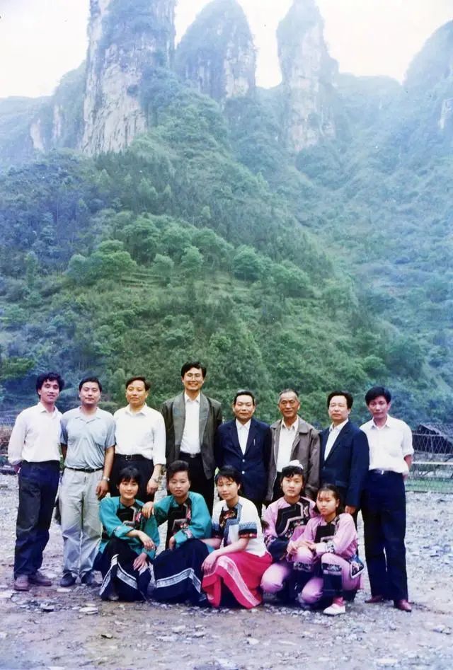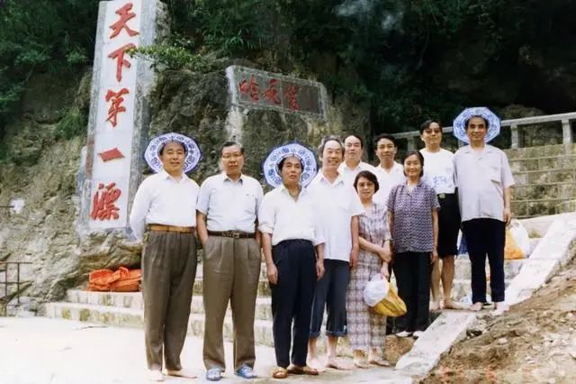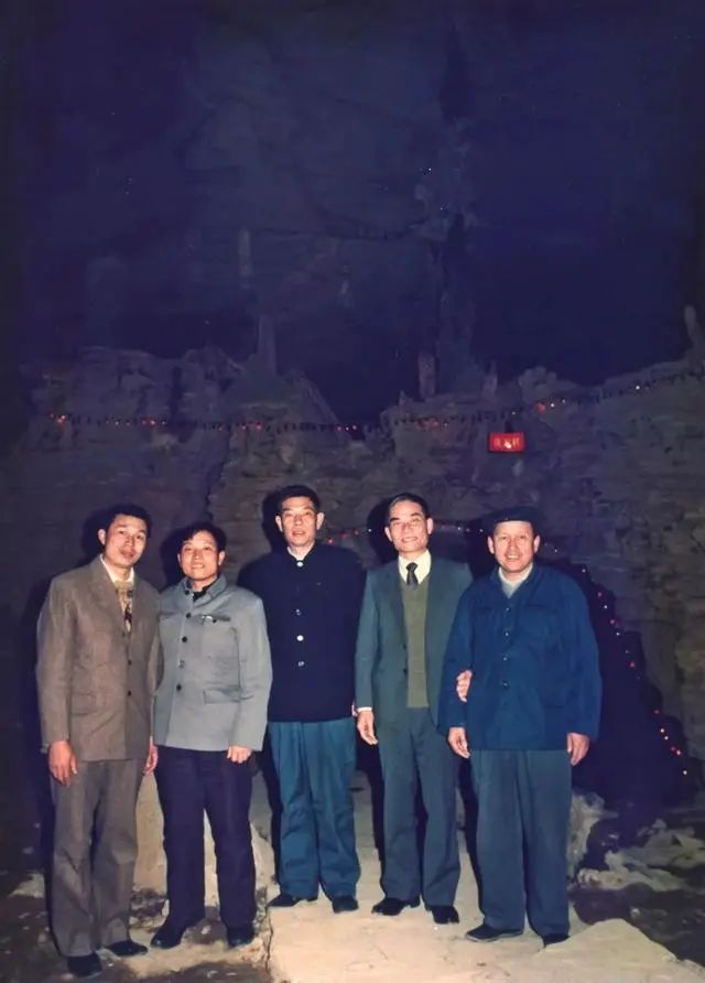 ▲ 1989年,武吉海(左二)、魏殿荣(左五)、吕大光(左三)陪同广州市白云区委书记李治元(左四)、区政府尹副区长(左一)考察吉首寨阳堂乐洞,时任吉首市常务副市长吕大光主抓旅游开发,一年多时间完成了寨阳堂乐洞、矮寨德夯盘古峰的游道、景区建设