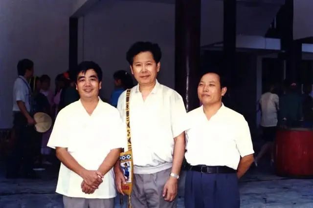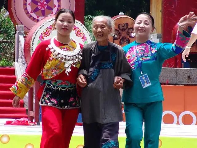 ▲ 2005年6月,吉首市举办第一届中国苗族鼓文化节,苗族第一代鼓王龙英棠(左二)与第二代苗族鼓王石顺明(左三)、第三代苗族鼓王龙菊兰(左一)同台与观众见面 张谨摄