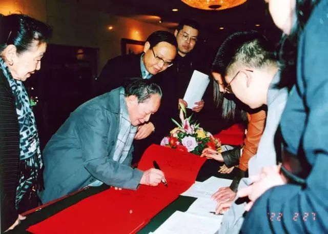 ▲ 2002年,黄永玉先生邀请黄苗子(左二)、郁凤(左一)夫妇等老友参加在北京香格里拉酒店举办的凤凰国家级历史文化名城新闻发布会,作者(左三)迎接黄苗子签到