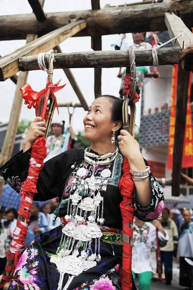 ▲ 2011年,花垣县排料乡苗族赶秋节,苗族妇女荡八人大秋千