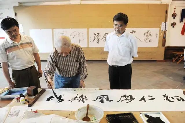 ▲ 2010年,应家乡凤凰县委县政府请求,黄永玉先生在凤凰玉氏山房题写“铜仁凤凰机场”,为凤凰旅游揽客助力(左起:罗明,黄永玉,张永中)