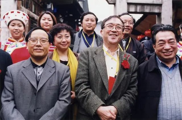 ▲ 2002年,谢晋导演(左二)率电影“芙蓉镇”剧组重返芙蓉镇,彭对喜(左三)、武吉海(左一)、梁秋松(后排右一)、龙文辉(后排右二)等陪同
