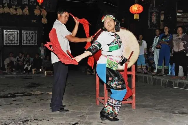 ▲ 2014年,保靖县吕洞山苗寨入夜聚会,苗族妇女击打苗鼓