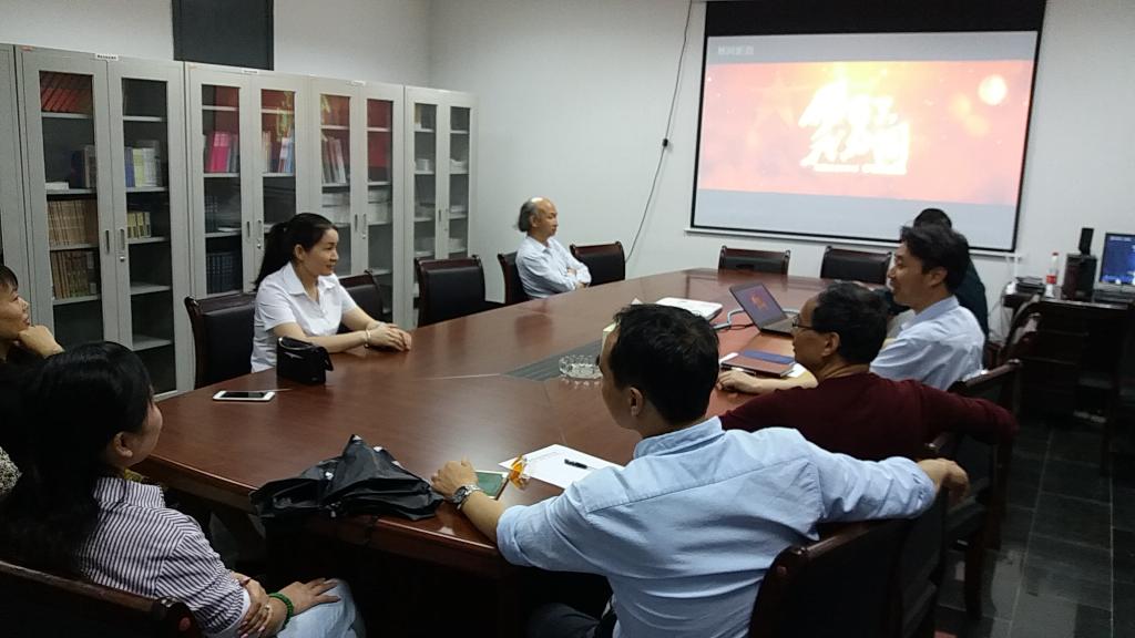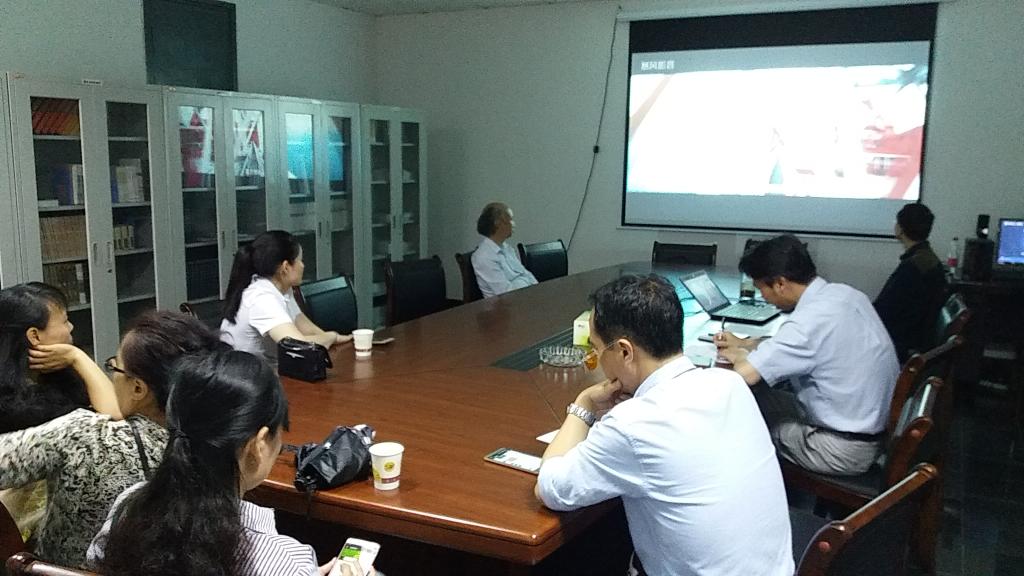 (图为《厉害了,我的国》纪录片在会议室播放)