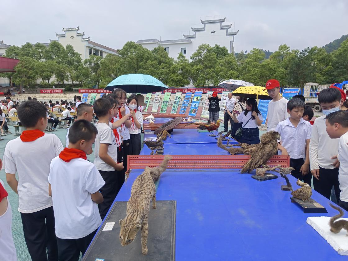 上午八时,在启动仪式开始前,志愿者们在里耶小学田径场为后续科普宣传讲解做准备工作:悬挂科普活动横幅、树立科普宣讲展板、摆放动植物标本……以便学生更了解、学习相关科学知识。启动式结束后,各式展板和各种动植物标本吸引了大批学生驻足参观,志愿者们耐心为他们一一介绍讲解。