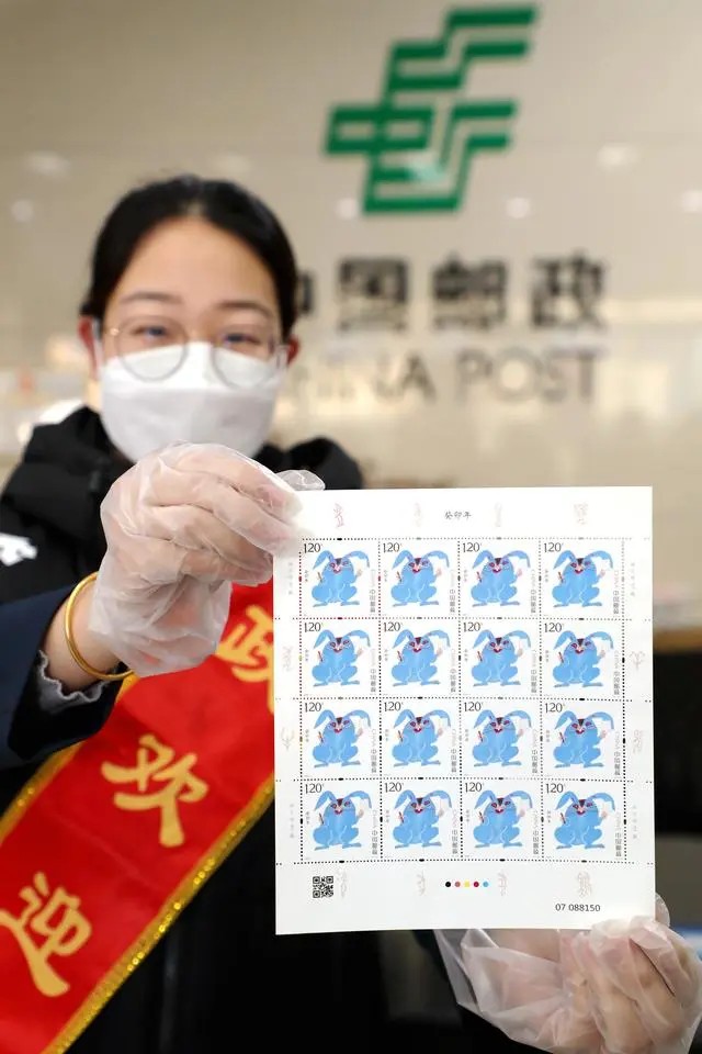 1月5日,在安徽阜阳,邮政工作人员展示《癸卯年》特种邮票。新华社发(卢启建 摄)