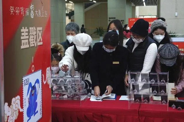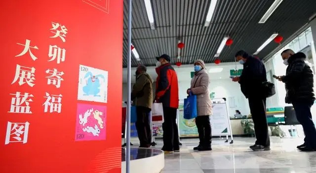 1月5日,在江苏省连云港市海州区一邮政网点,集邮爱好者排队购买《癸卯年》特种邮票。新华社发(耿玉和 摄)