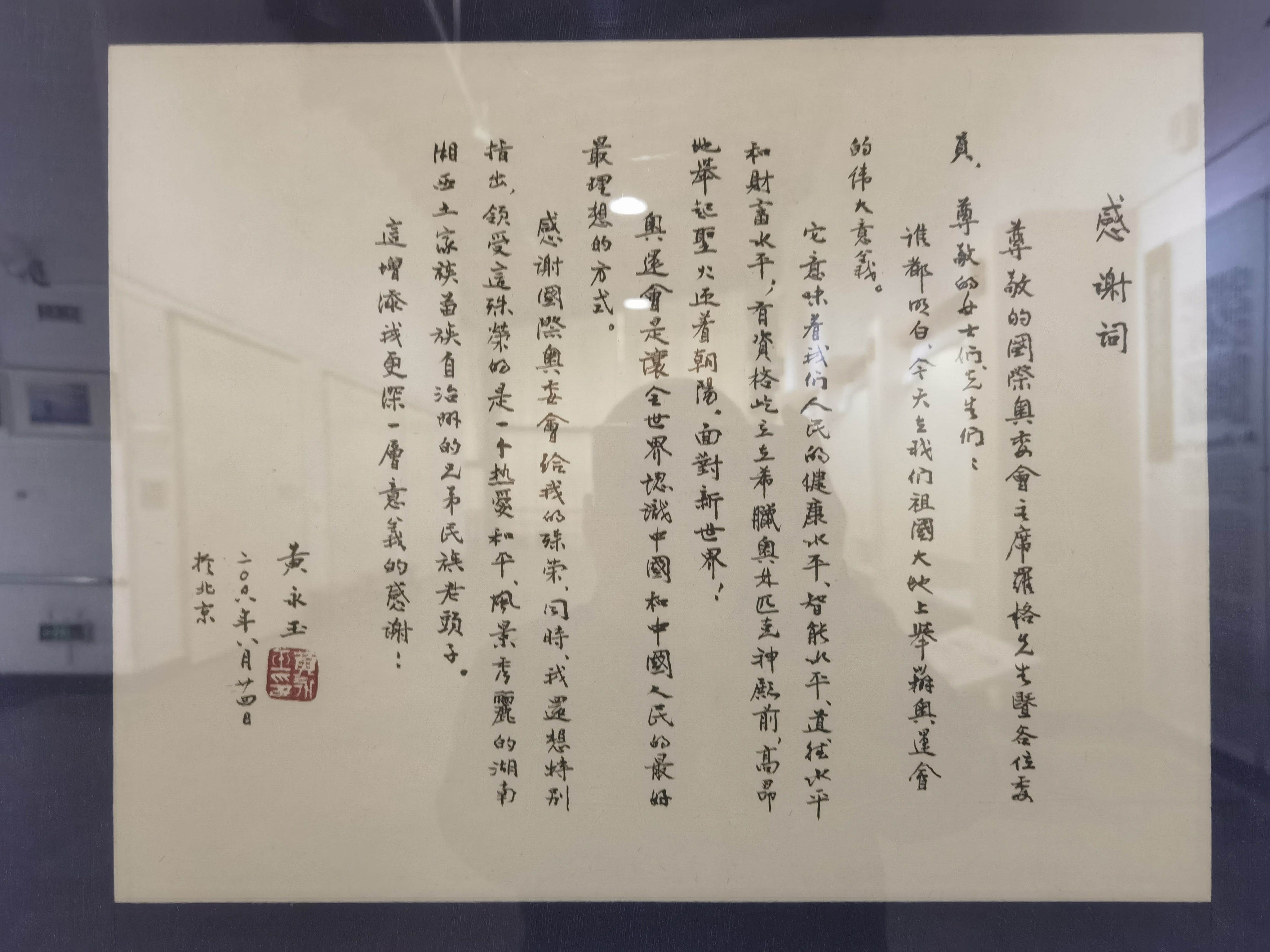 感谢奥运会给我的殊荣,同时要特别指出,领受这殊荣的是一个湖南、湘西、土家族苗族自治州的八十五岁的土家族老头儿。