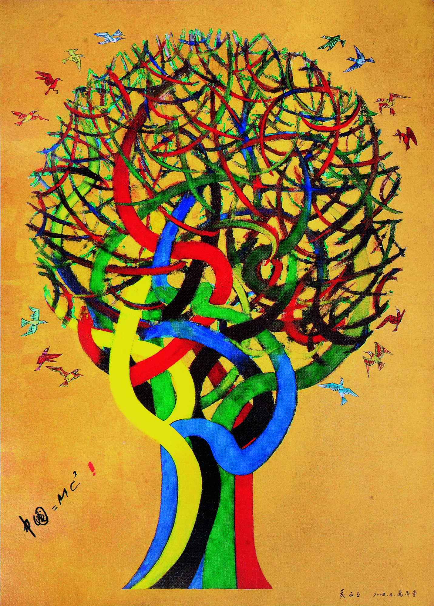 2008年7月9日,刚过完84岁生日的黄永玉先生为表达对北京奥运会的祝福,花了10天时间,创作了该幅高3.5米、宽2.5米的油画《中国=MC²》。该画用华丽高贵的金色,烘托着画中央挺立的五色大树,五条色带如丝绸般轻盈,从根部蜿蜒起伏飘然而升。没有一个完整的环状,却让人感到奥运五环的无处不在;枝节复杂、结构奇崛的巨大树冠,又分明让人看到奥运建筑“鸟巢”框架的韵味。大树旁,翩翩飞舞的彩鸟环绕,更让整个画作动静相宜、飘逸而静谧。