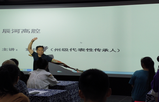 此次非遗大讲堂由辰河高腔州级代表性传承人章民权主讲,由文化教育场馆管理中心办公室主任何伟主持,文化教育场馆部分志愿者以及湘西职业技术学院、吉首大学师范学院部分学生参与了此次活动。