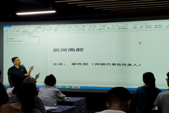 讲堂伊始,章民权老师为我们简单介绍了辰河高腔的发源与发展历程,辰河高腔俗称辰河戏,主要发源于浦市镇,是湖南省传统戏曲剧种,2006年被列入第一批国家级非物质文化遗产保护名录。辰河戏音乐在衍化、发展过程中,形成高、低、昆、弹四种声腔,其中曲牌体声腔艺术唱腔优美、高亢动人、曲牌丰富,以浦市高腔最为优美。